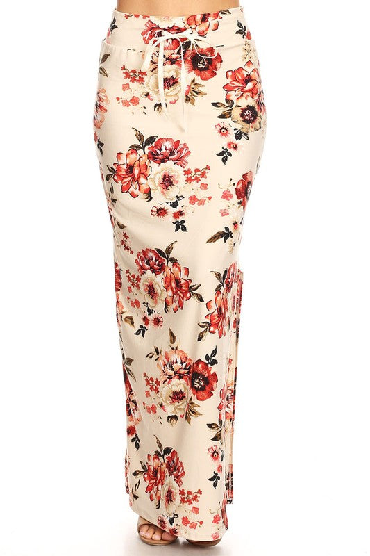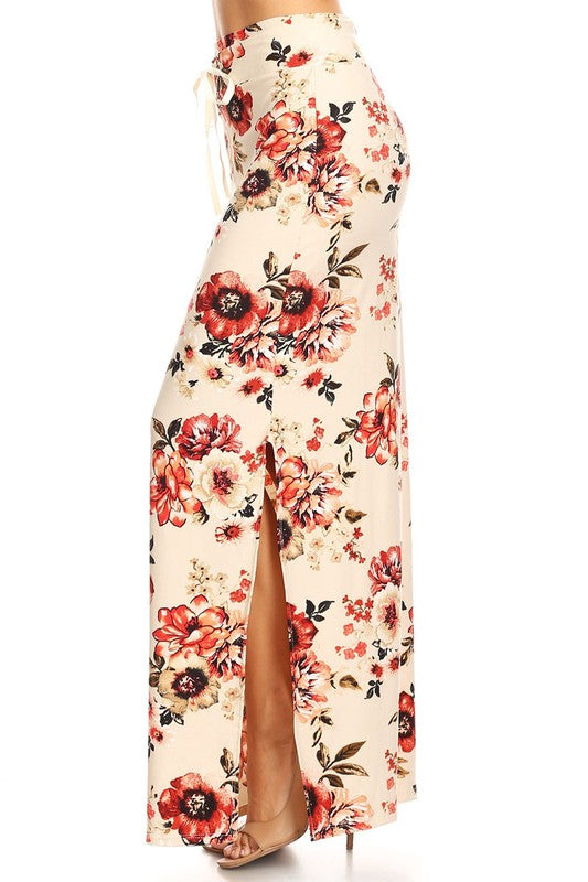 Floral printed high waist maxi skirt with a drawstring waist and side slit.