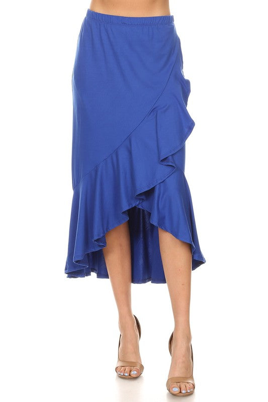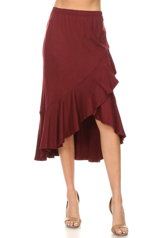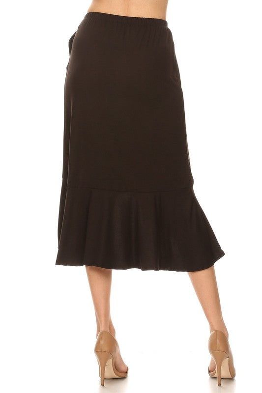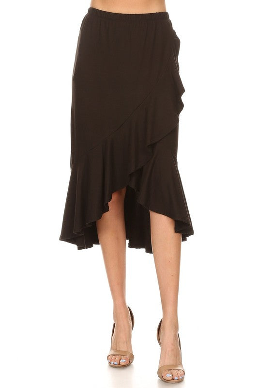 Solid, stretch, faux wrap midi skirt with ruffle and elastic waist.